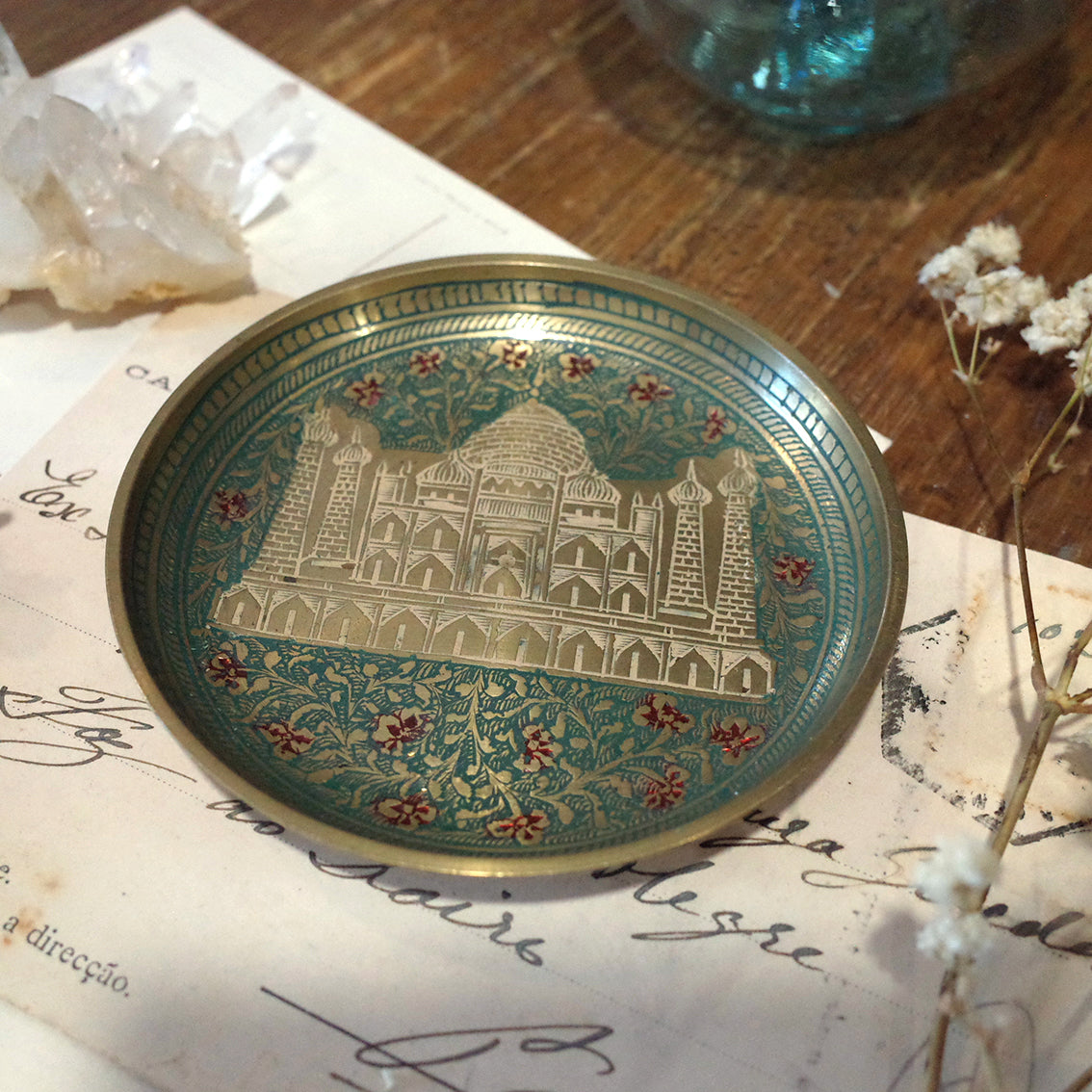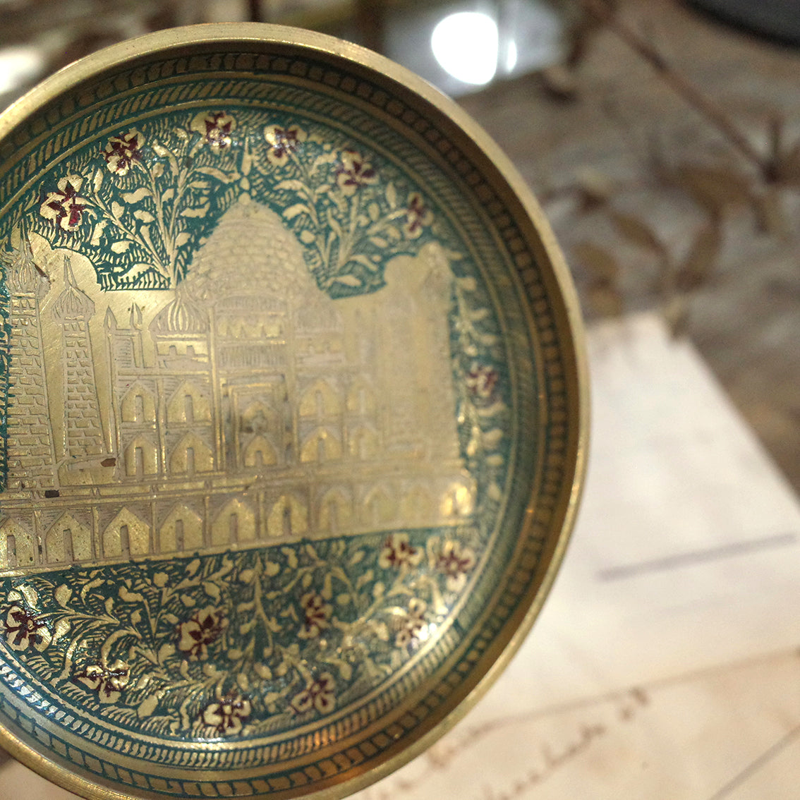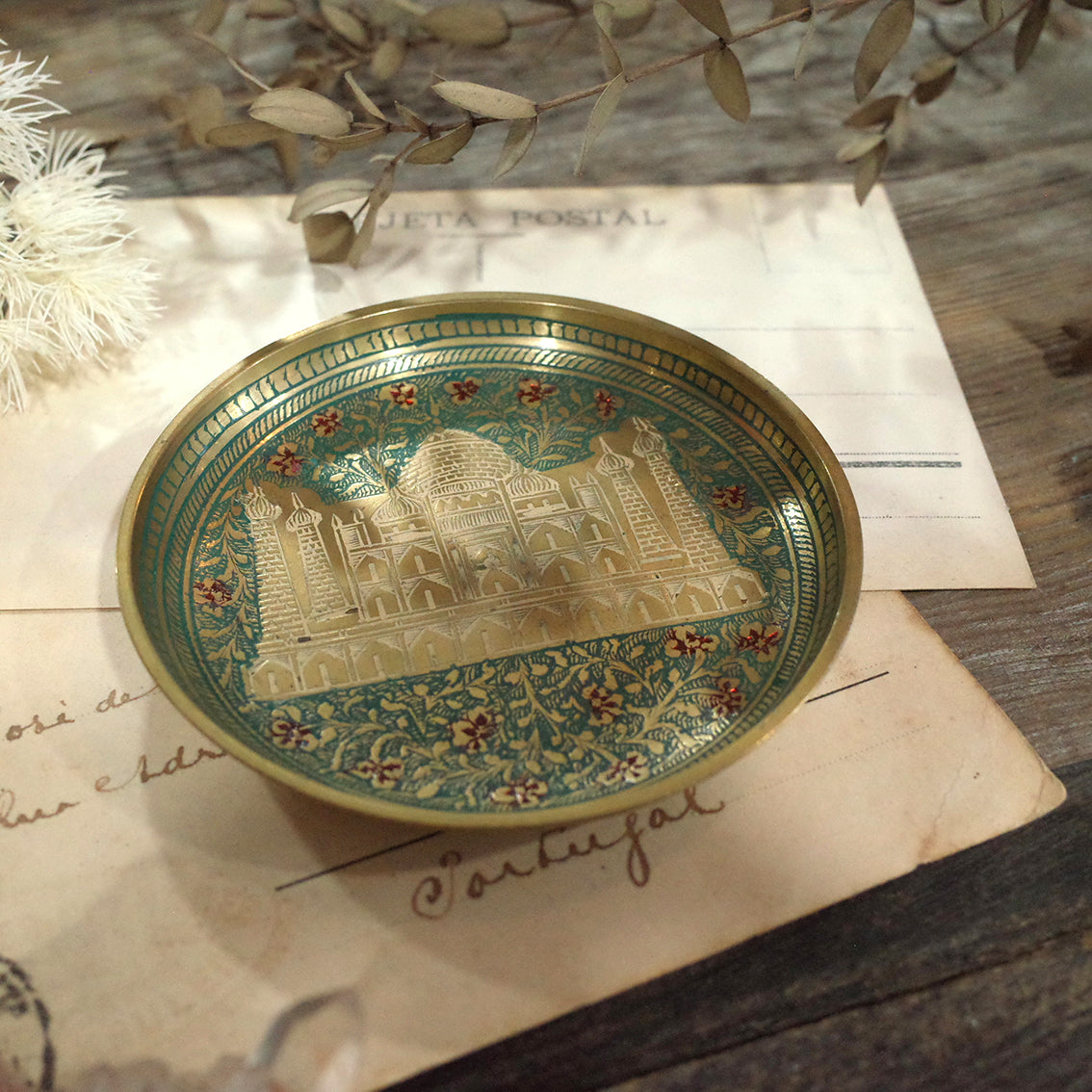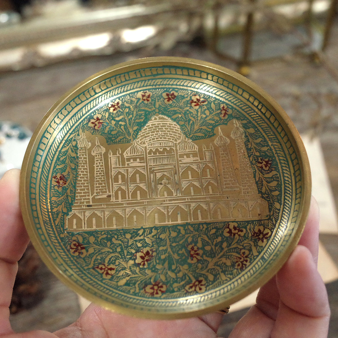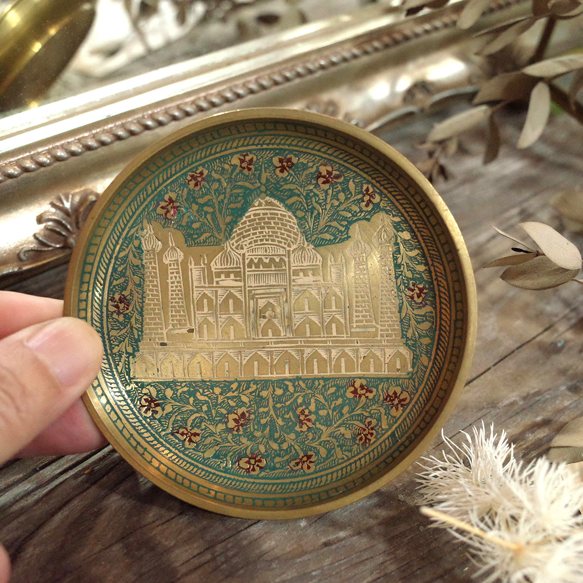 印度老件.泰姬瑪哈陵、花卉圖蝕刻琺瑯銅盤.金屬盤.小置物盤.細節美#收藏品