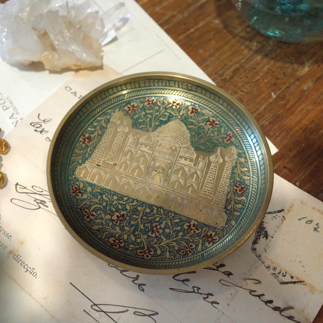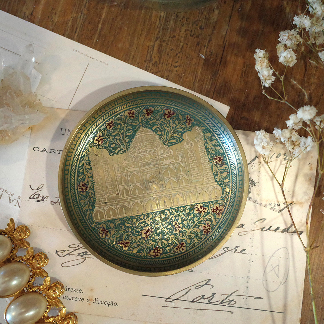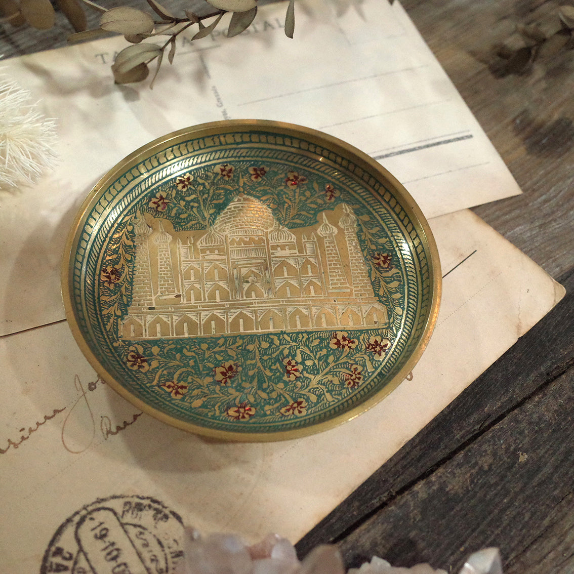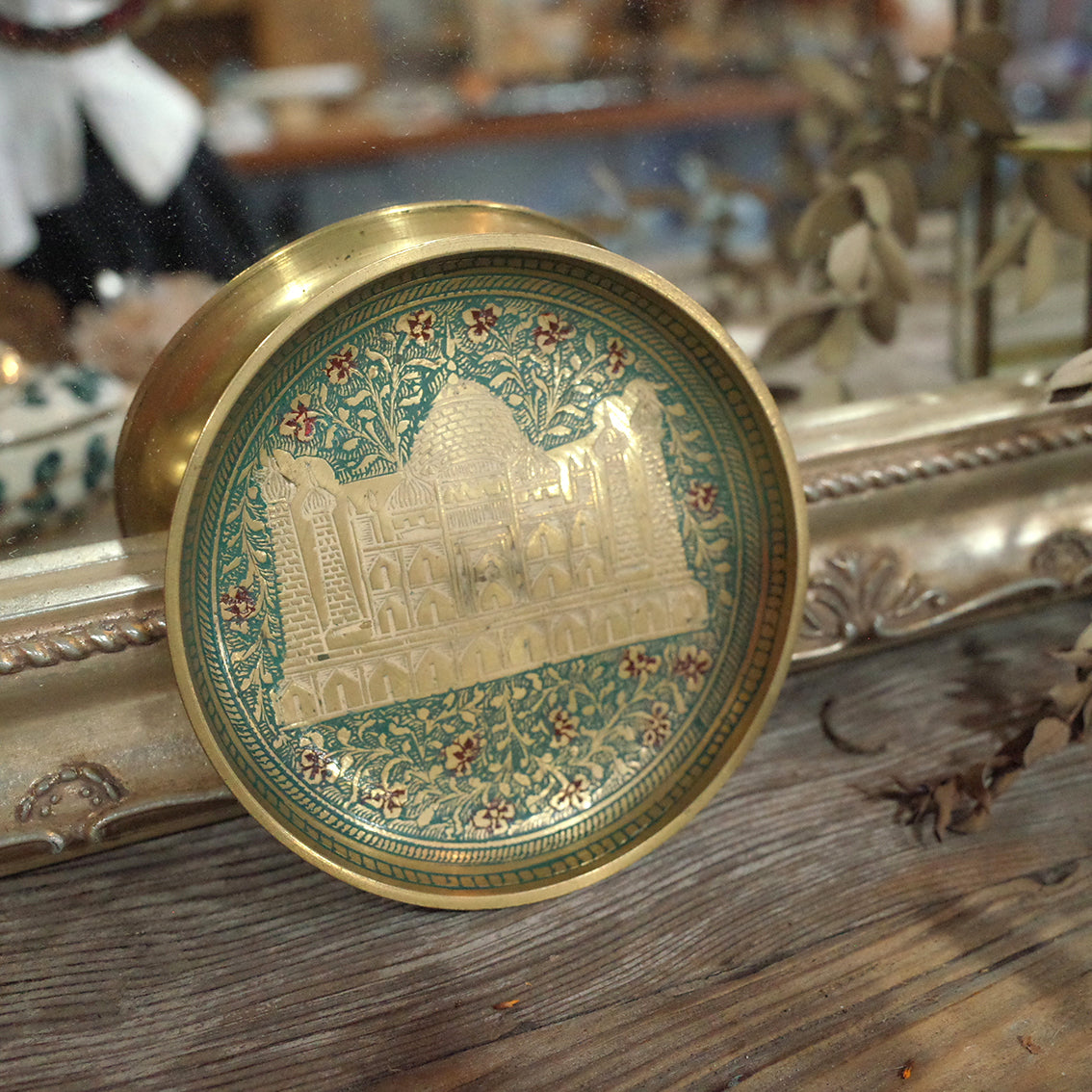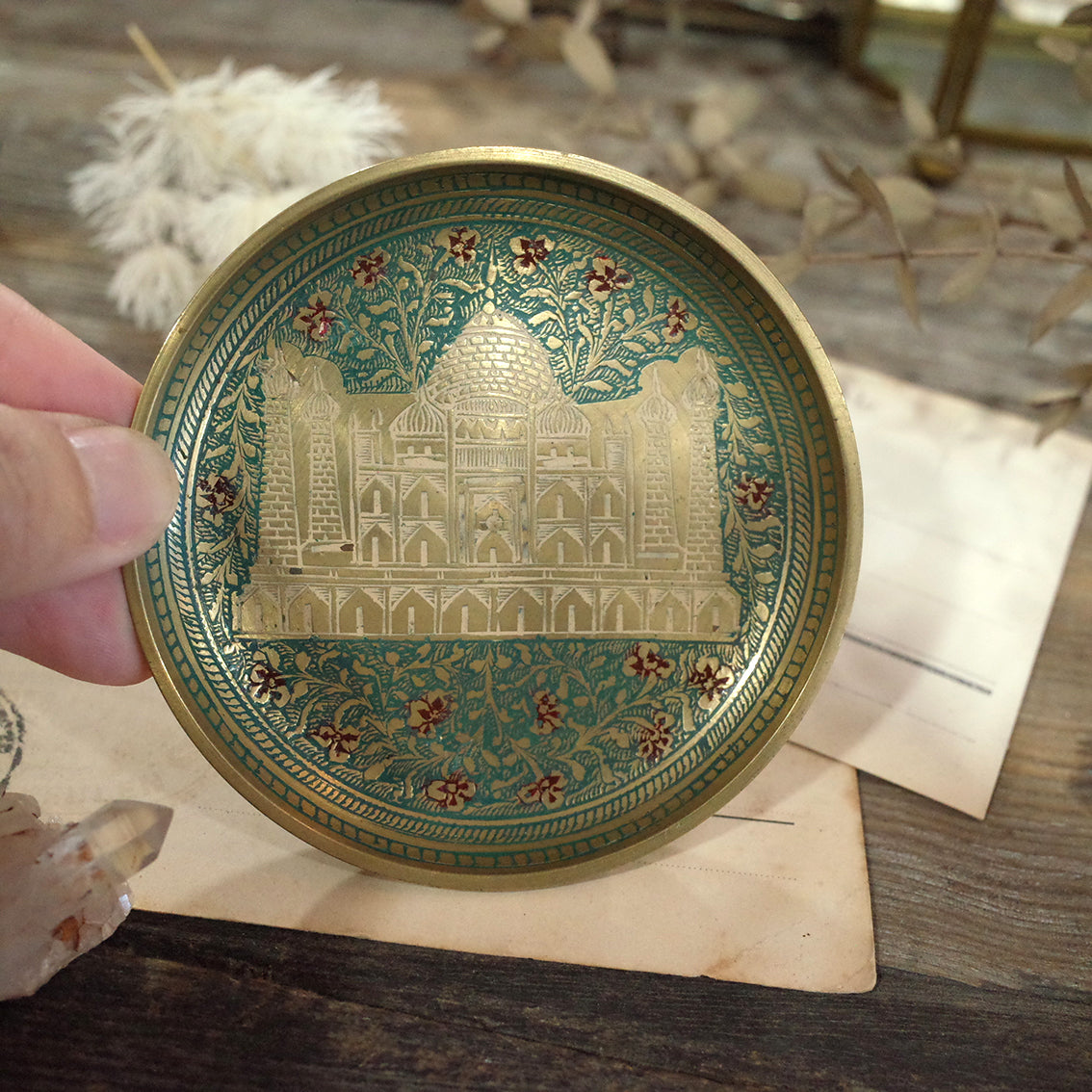 印度老件.泰姬瑪哈陵、花卉圖蝕刻琺瑯銅盤.金屬盤.小置物盤.細節美#收藏品