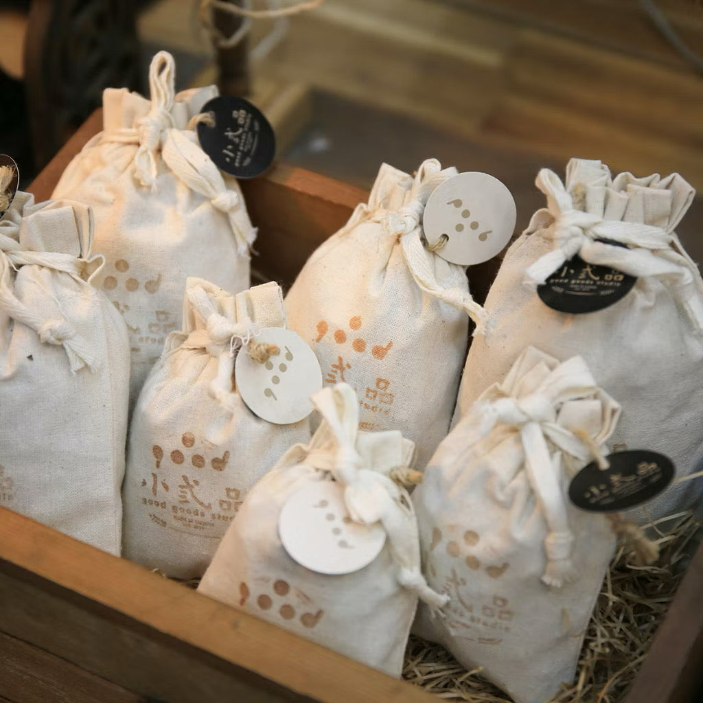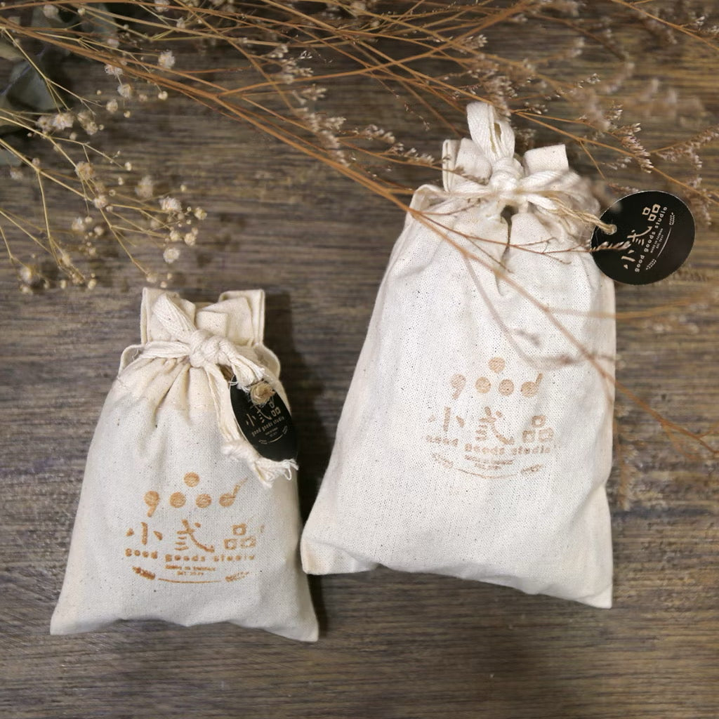 採用無染色或漂白之天然厚棉布束口袋承裝,香味自然散發不刺鼻、
