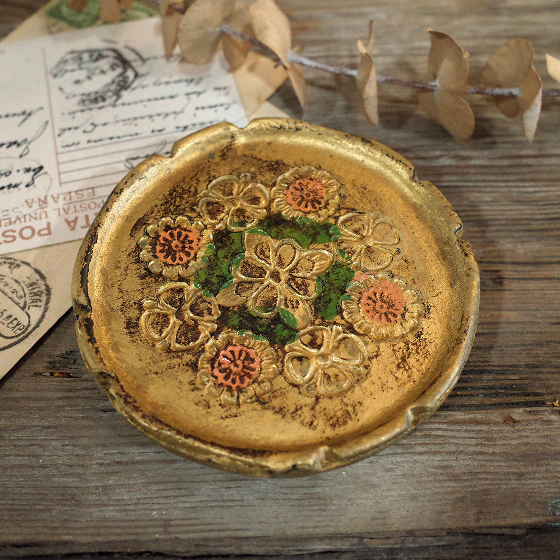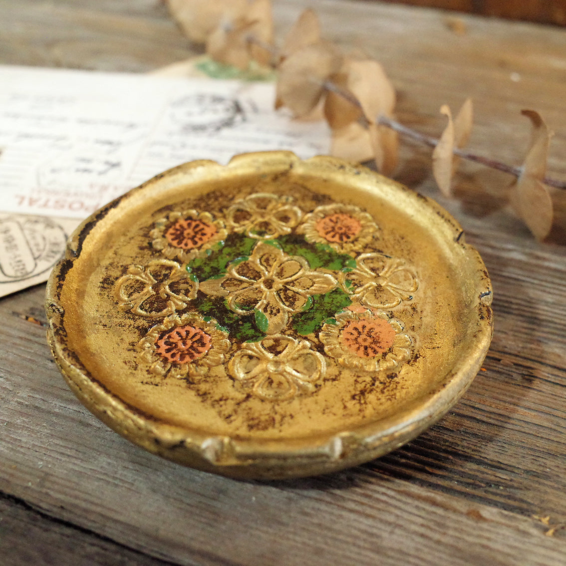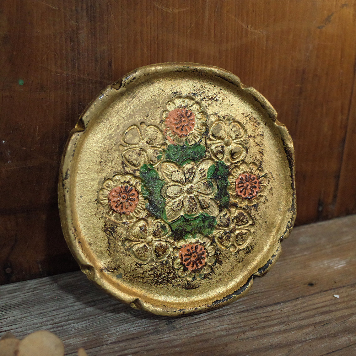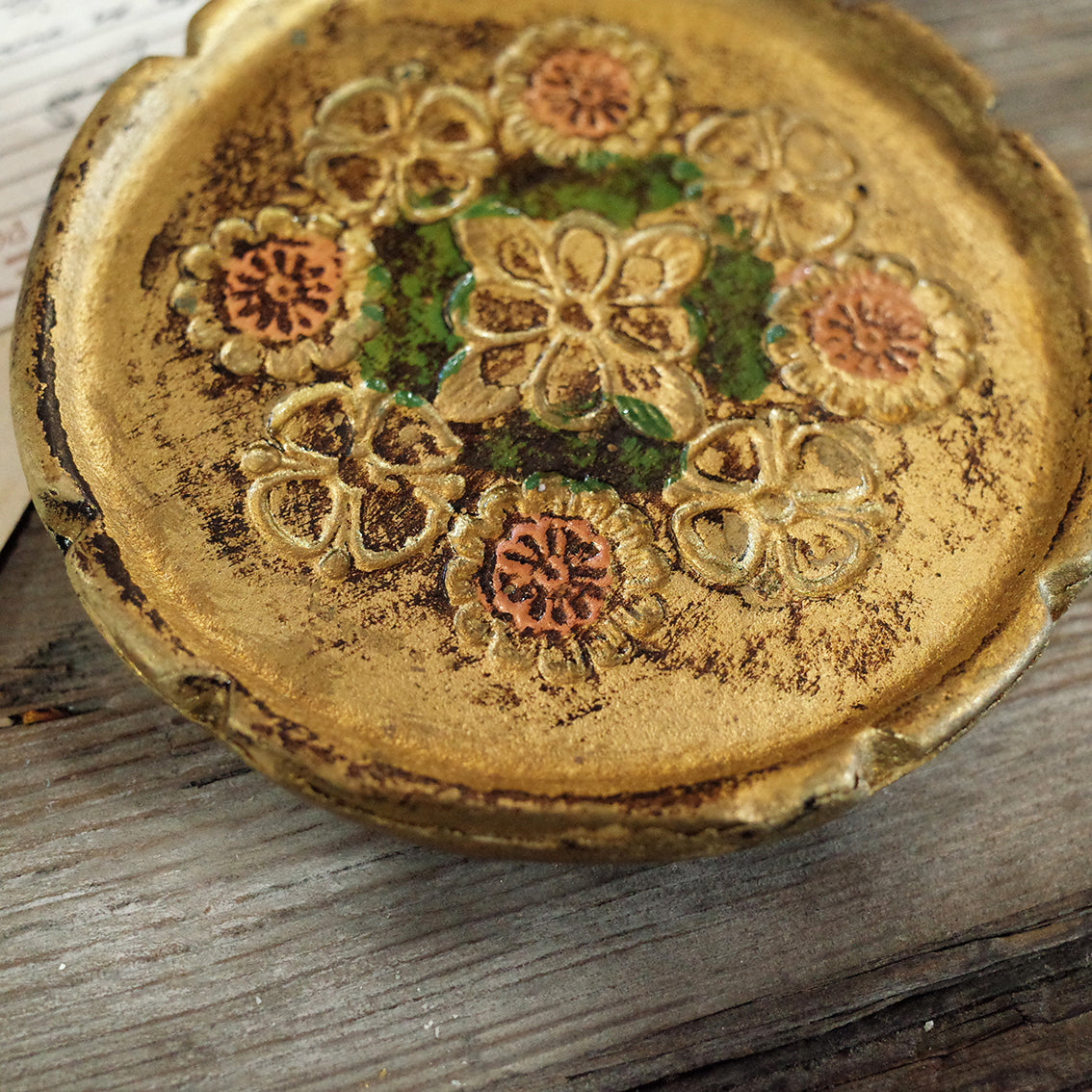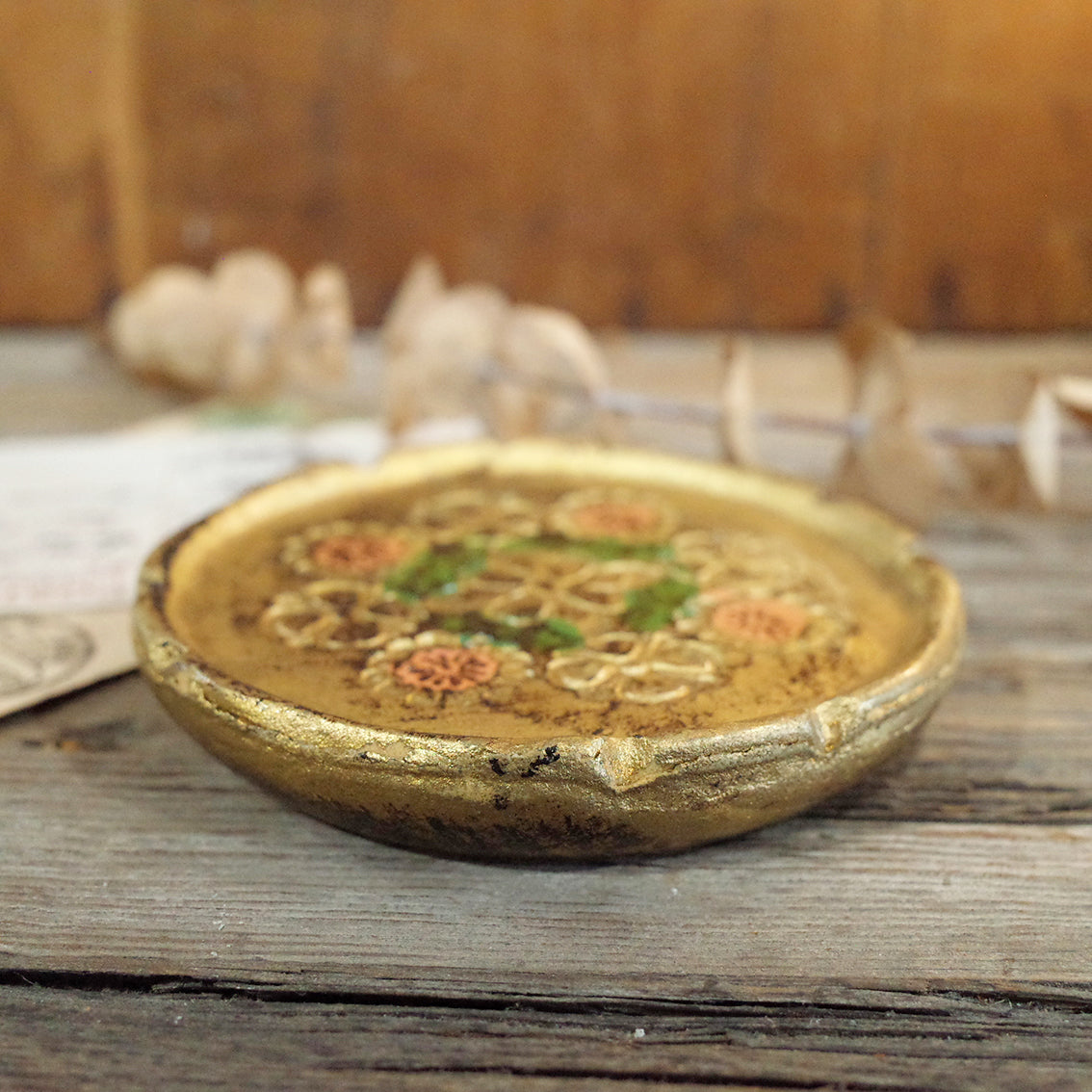 在木器上施以金底彩繪的工藝,源於中世紀的宗教藝術傳統,後來廣泛應用於日常器皿的裝飾。既是實用的置物小盤,更是義大利手工藝文化的珍貴見證。