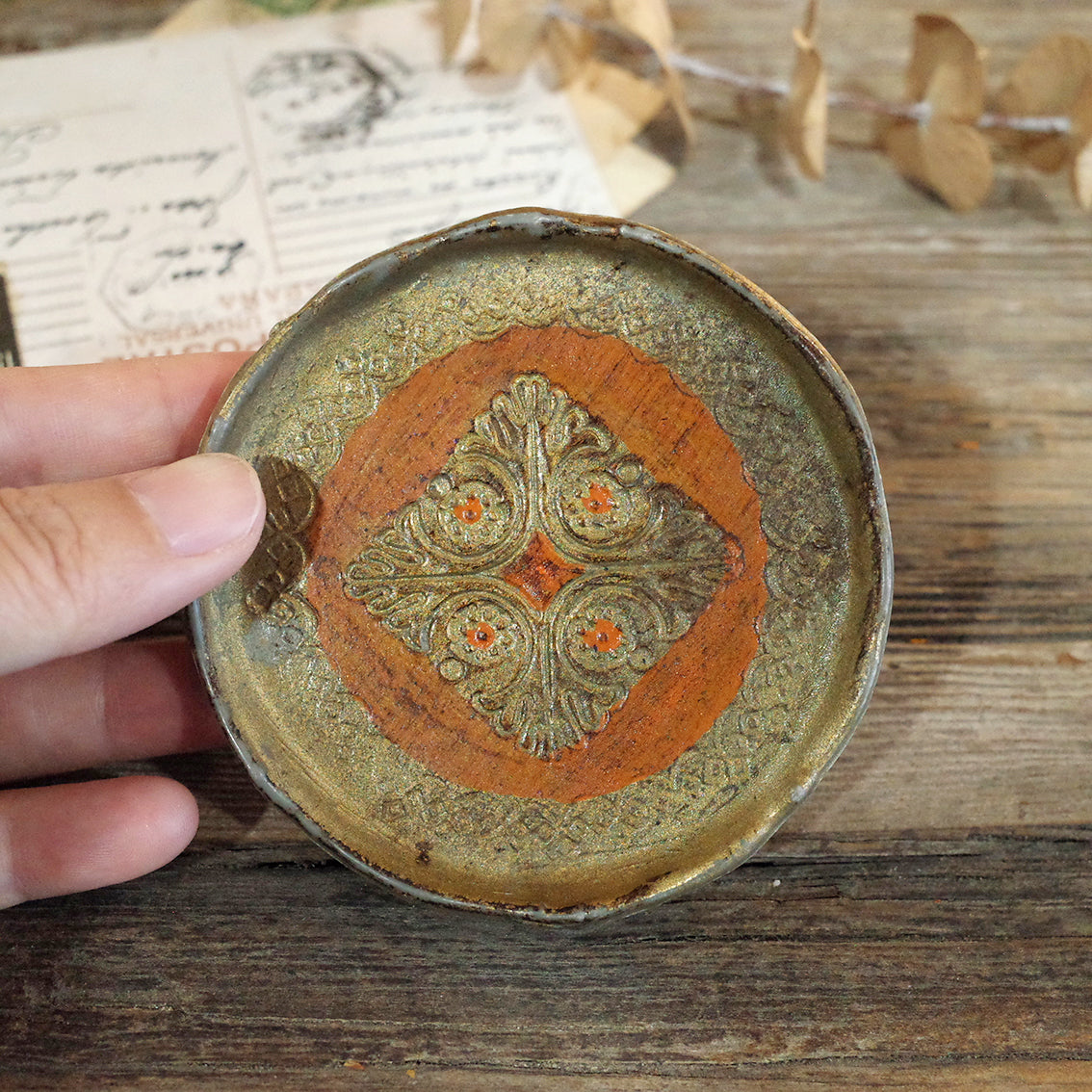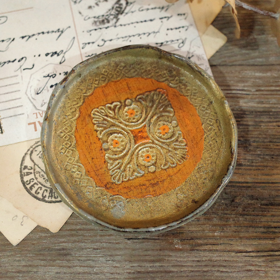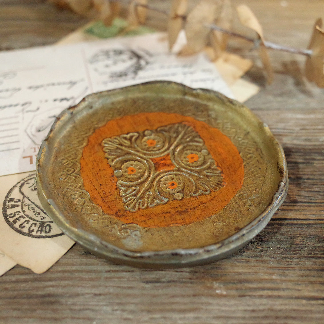 義大利的手工彩繪小盤,宛如從威尼斯面具工坊中走出的藝術精品,橘色底調溫暖如托斯卡尼的夕陽餘暉。中央的巴洛克式花卉浮雕,以金漆勾勒出層次豐富的立體紋理,四朵小花如紅寶石般點綴其間,展現了義式裝飾藝術的華麗與精緻。