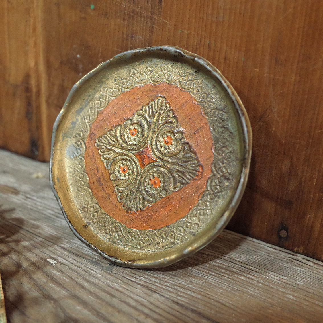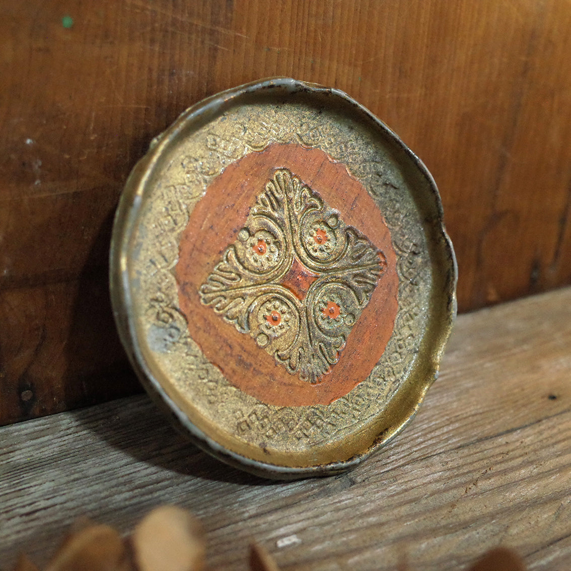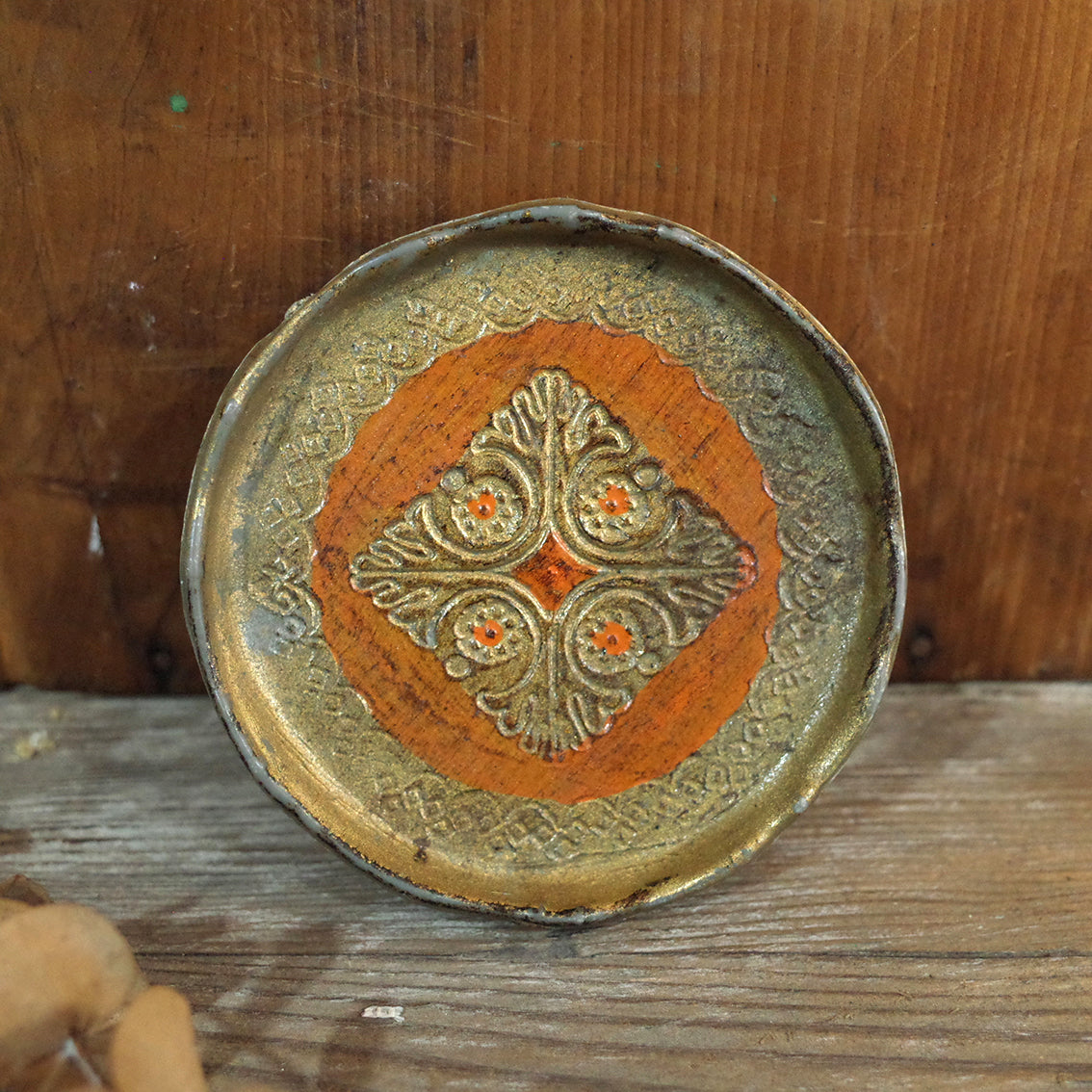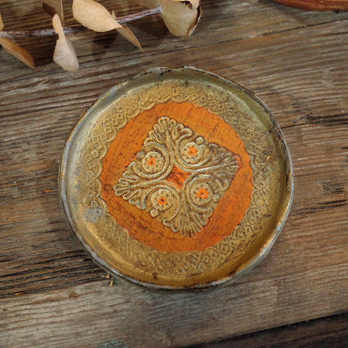 義大利老件|手工彩繪花卉金漆復古橘色花邊小盤.杯墊