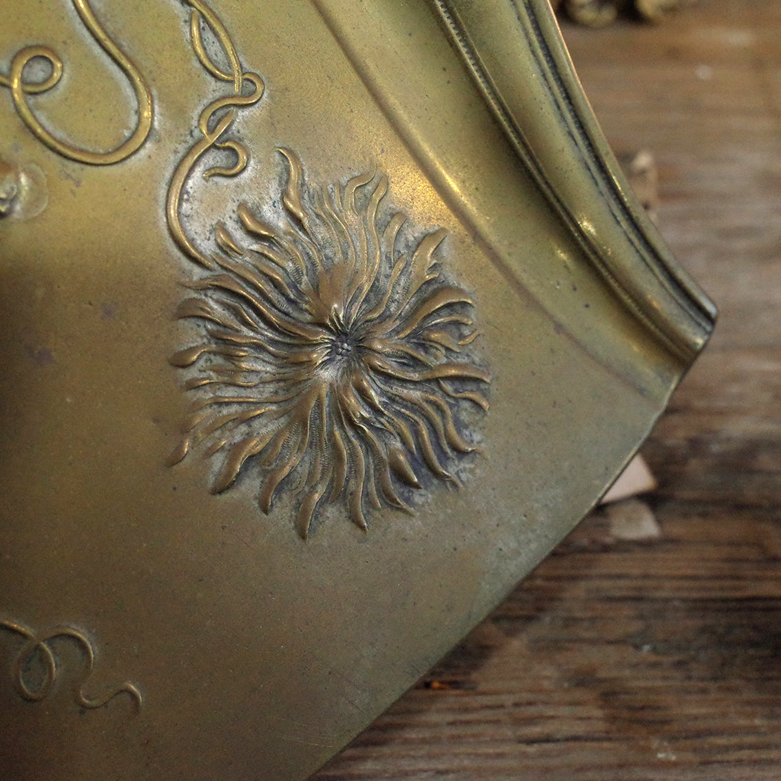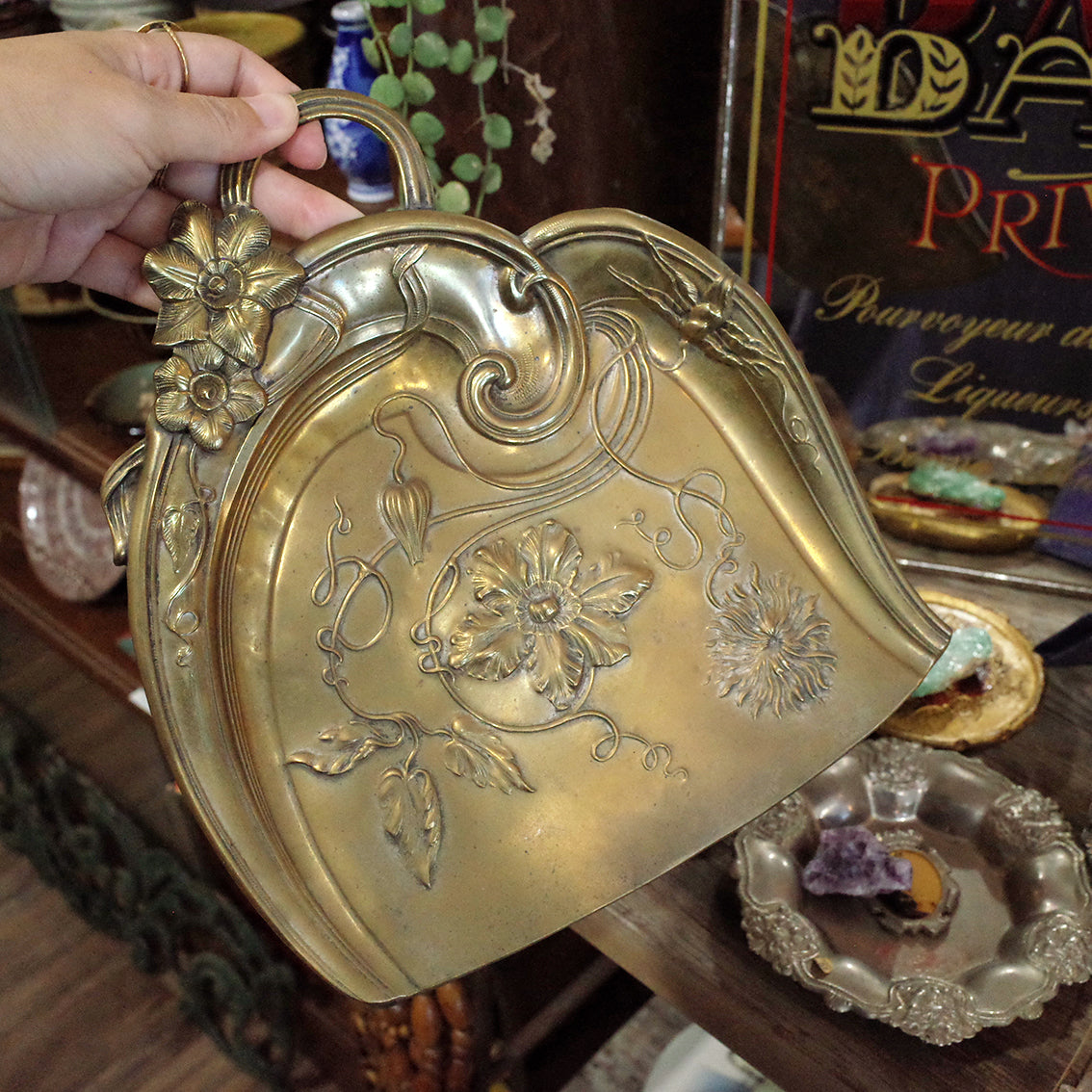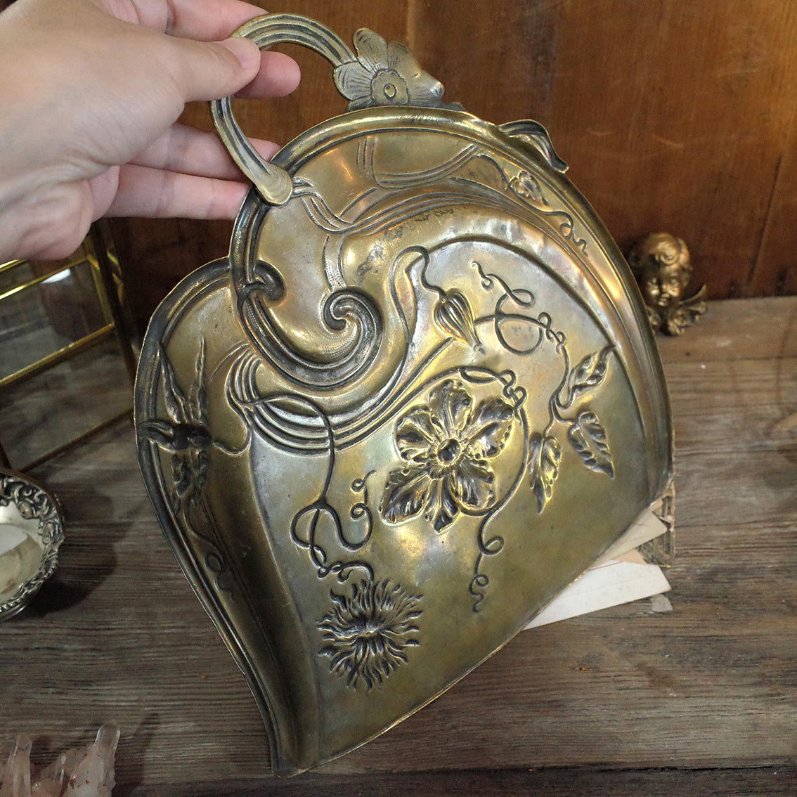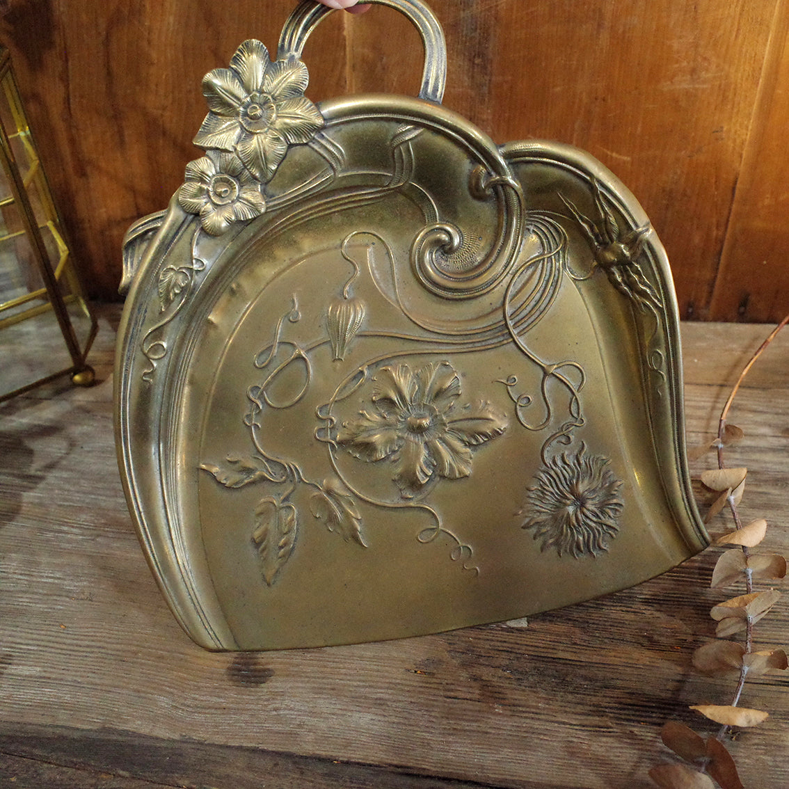 英國老件.古董黃銅手提麵包屑紙屑小畚箕.花卉浮雕銅製畚箕