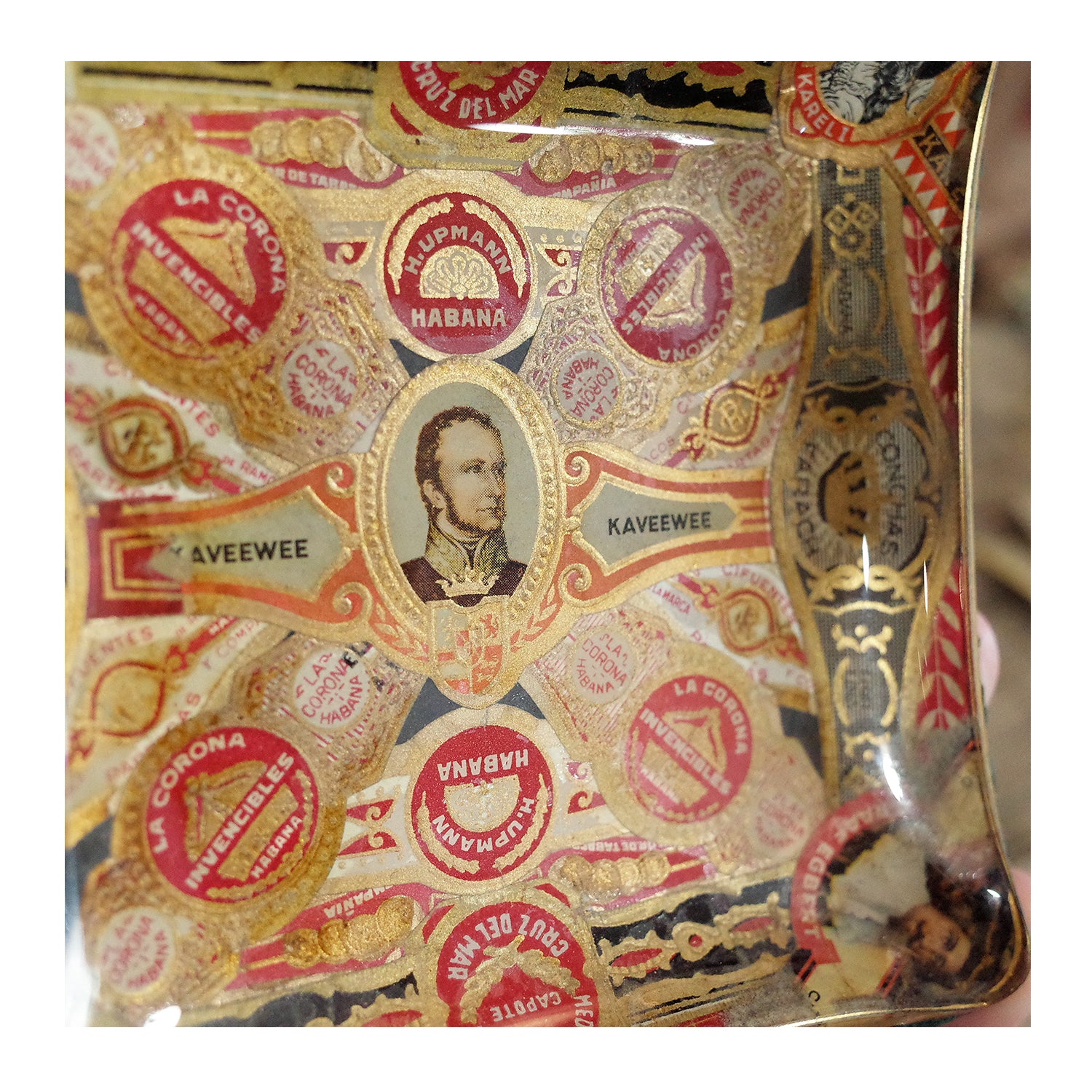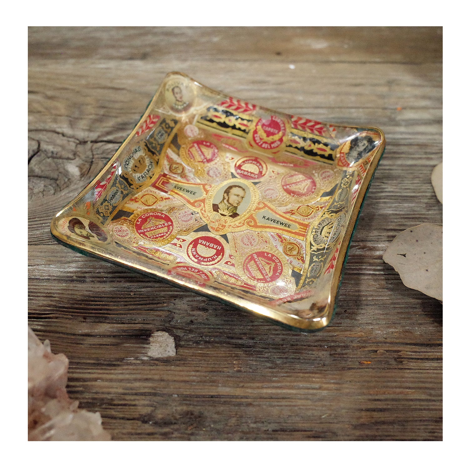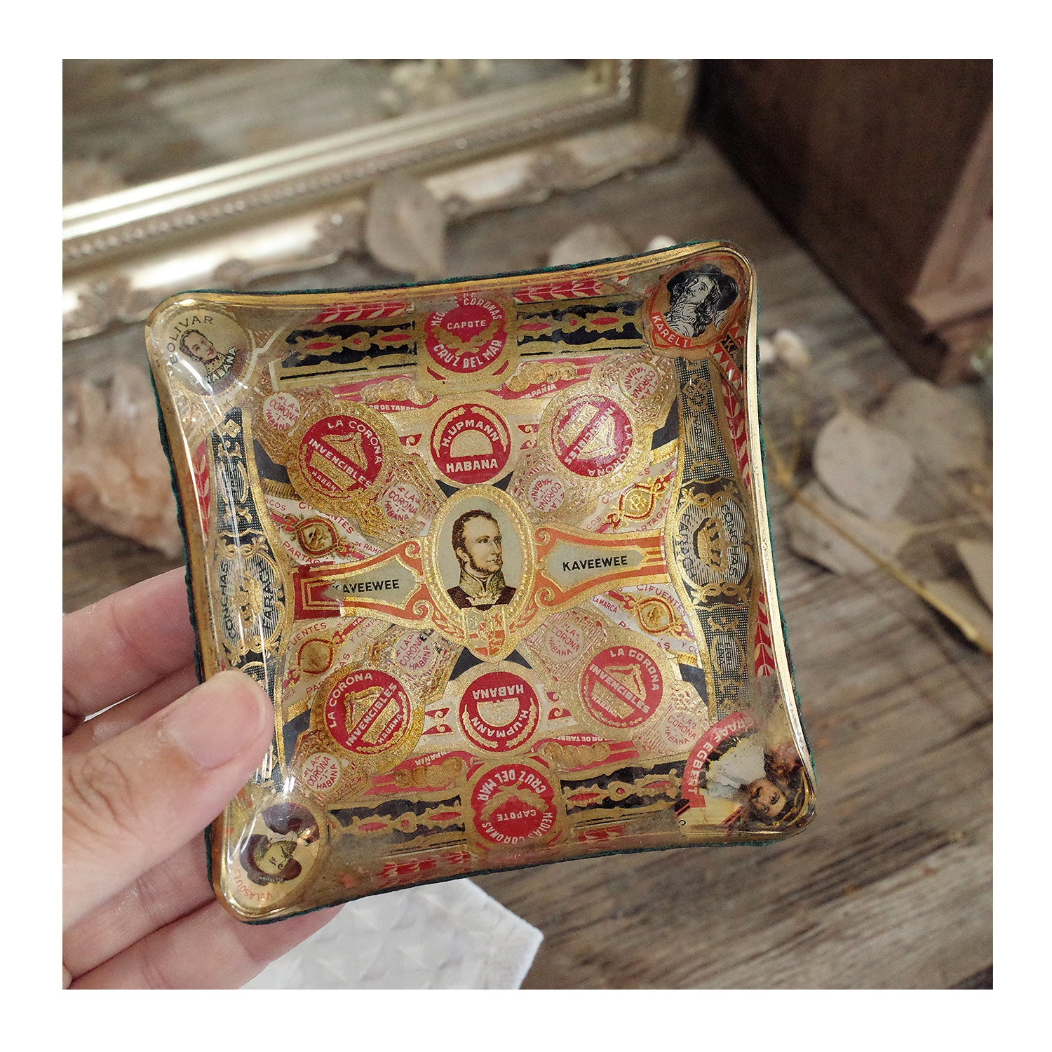 西班牙帶回老件.kaveewee.habana等雪茄環裝飾.曲面玻璃絨布底雪茄菸灰缸.稀有品
