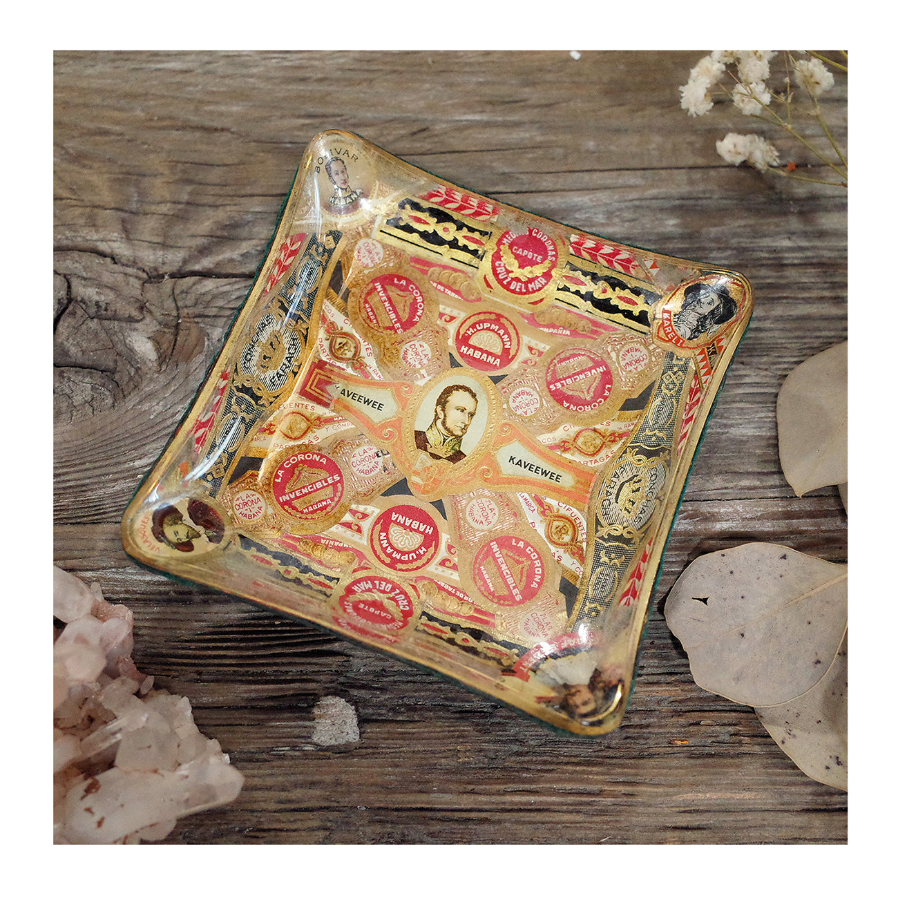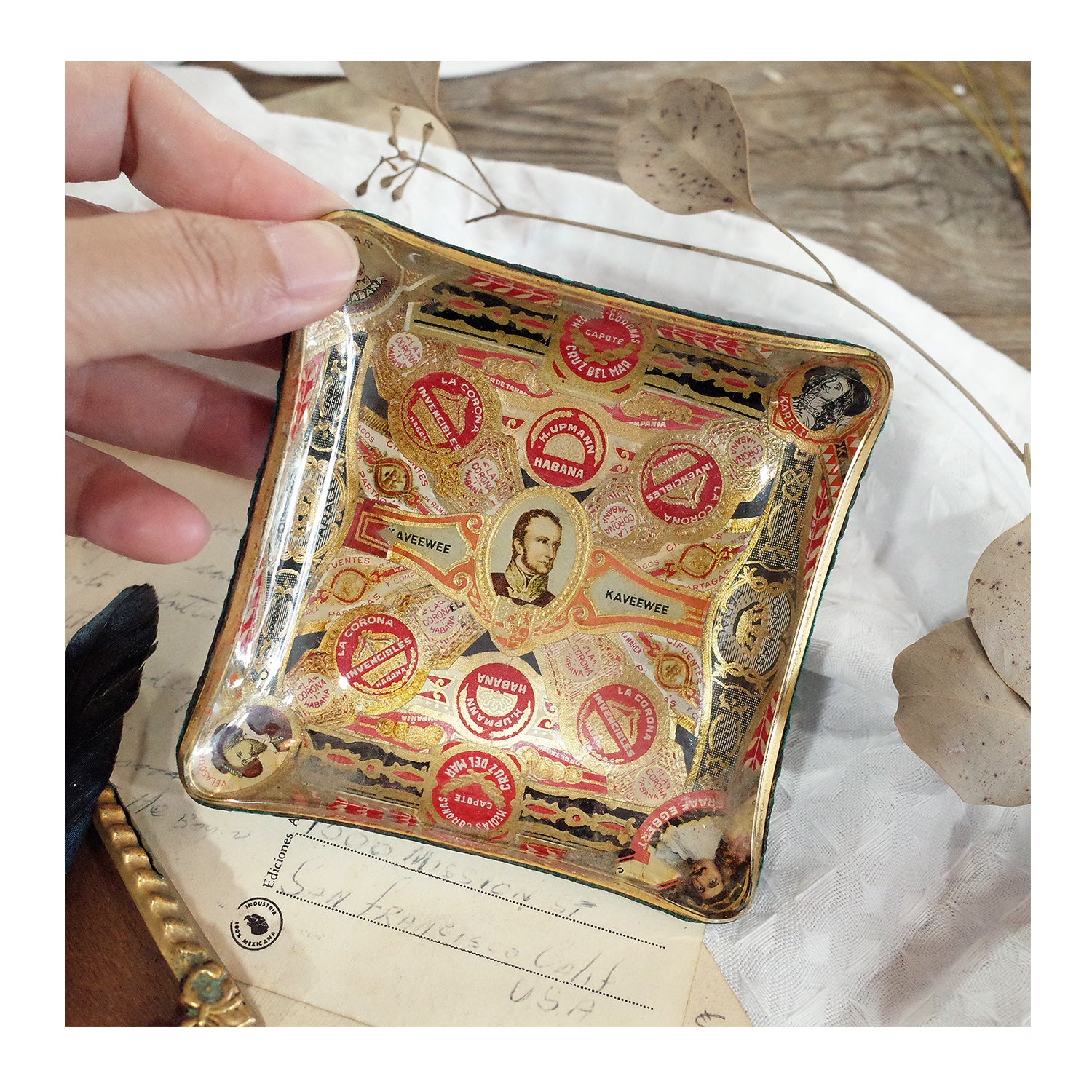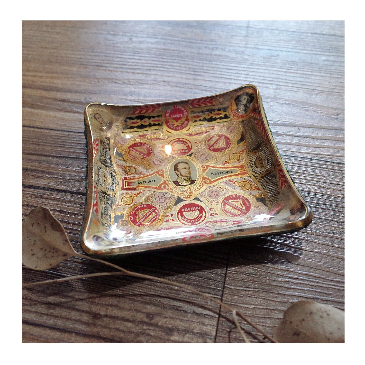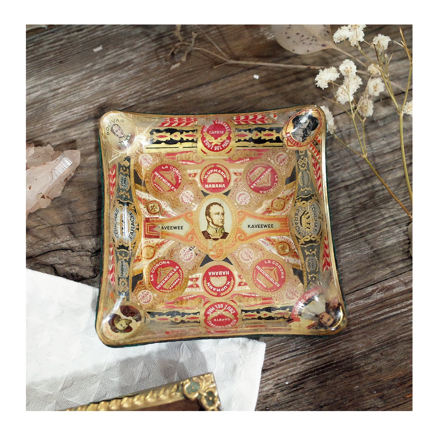 西班牙帶回老件.kaveewee.habana等雪茄環裝飾.曲面玻璃絨布底雪茄菸灰缸.稀有品